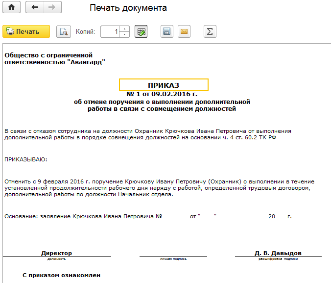 Проведем документ. Выведем на печать  приказ на отмену совмещения.