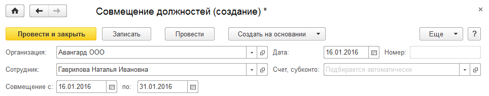 • Также документ можно ввести на основании приказа на совмещение.