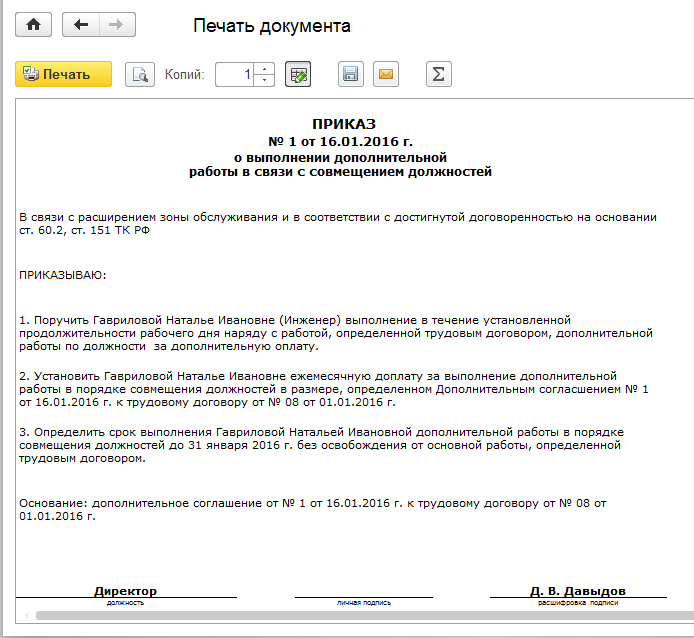 Проведем документ. Выведем на печать дополнительное соглашение и приказ на доплату за совмещение.