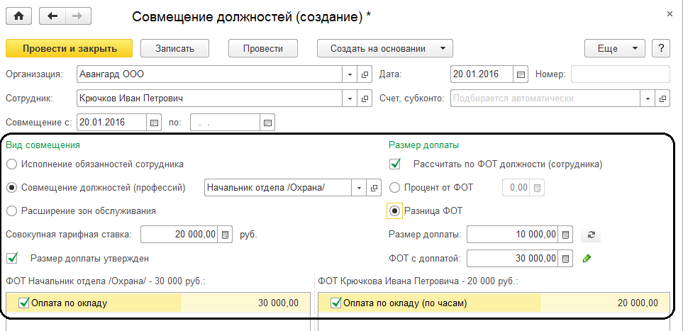 Выберем вариант оплаты: совмещение должностей, позицию штатного расписания – Начальник отдела/ Охрана. Размер доплаты будет рассчитываться от ФОТ должности как разница ФОТ сотрудника и ФОТ должности.
