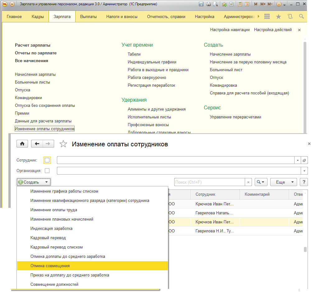 • Раздел "Зарплата / Изменение оплаты сотрудников".