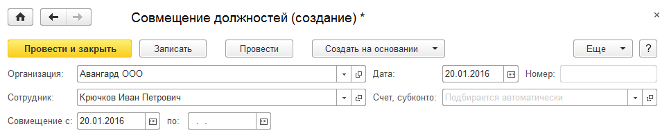 Крючкову И.П. с 20.01.2016 установили доплату за совмещение должности начальника отдела охраны, размер устанавливается разницей от ФОТ по данной позиции. Отразим данную ситуацию в программе. Для этого в разделе "Зарплата/ Изменение оплаты труда" создадим документ "Совмещение должностей", заполним данные о сотруднике и периоде назначения доплаты.