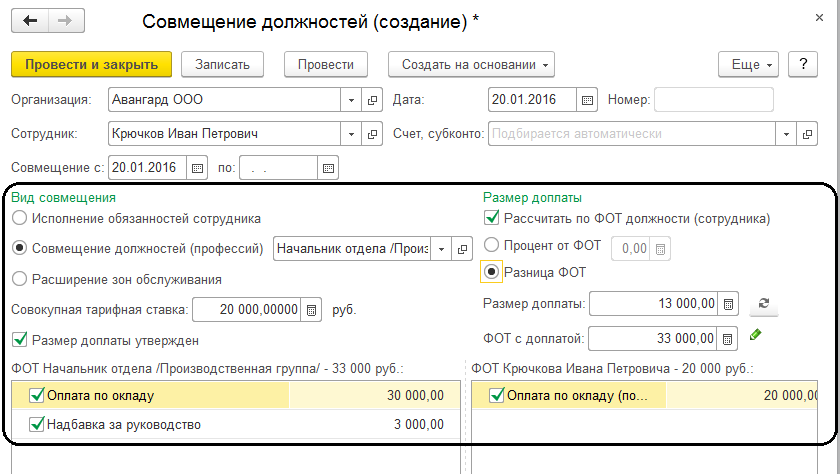 Выберем вариант оплаты: совмещение должностей, позицию штатного расписания – Начальник отдела/ Охрана. Размер доплаты будет рассчитываться от ФОТ должности как разница ФОТ сотрудника и ФОТ должности.