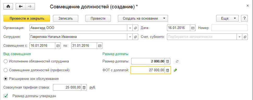 Гавриловой Н.И. с 16.01.2016 по 31.01.2016 назначена доплата за расширение зон обслуживания в размере 2 000 руб. Отразим данную ситуацию в программе. Для этого в разделе "Зарплата/ Изменение оплаты труда" создадим документ "Совмещение должностей", заполним данные о сотруднике и периоде назначения доплаты.