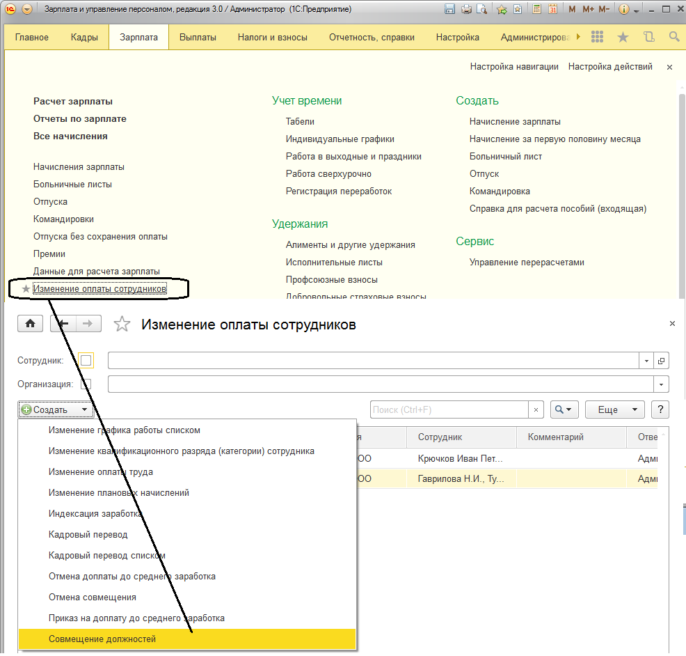 • Раздел "Зарплата / Изменение оплаты сотрудников".