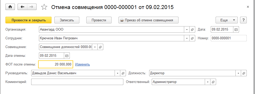 Проведем документ. Выведем на печать  приказ на отмену совмещения.