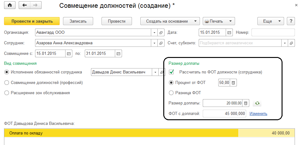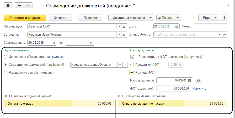 Выберем вариант оплаты: совмещение должностей, позицию штатного расписания – Начальник отдела/ Охрана. Размер доплаты будет рассчитываться от ФОТ должности как разница ФОТ сотрудника и ФОТ должности.