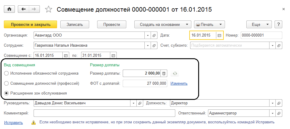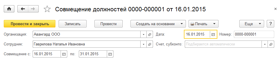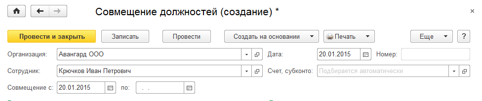 • Период совмещения (период может быть как закрытым, так и открытым, во втором случае для прекращения совмещения затем вводится документ "Отмена совмещения").