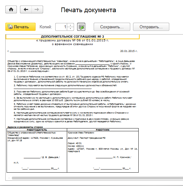 Проведем документ. Выведем на печать дополнительное соглашение и приказ на совмещение.