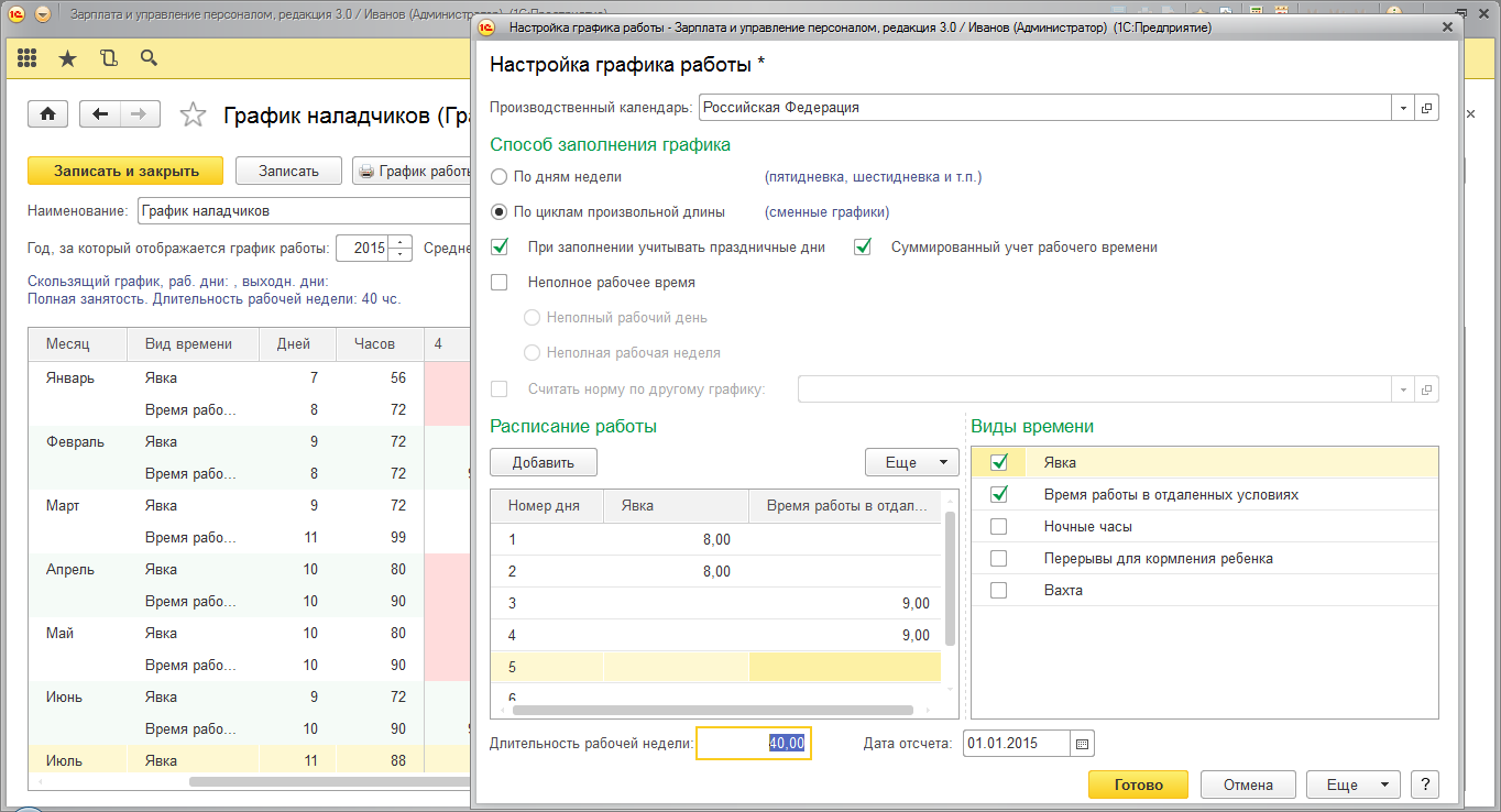 В организации трудятся наладчики оборудования, у которых в соответствии с трудовым договором , время работ в отдаленных районах должно оплачиваться по другому часовому тарифу. Наладчики трудятся по сменному графику -2 дня по 8 часов , 2 дня по 9 часов в отдаленных условиях, 2 дня выходных. В праздничные дни работа не выполняется.