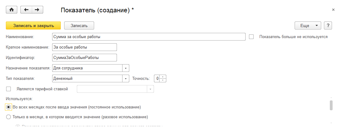 Создаем и настраиваем показатель "Сумма за особые работы". Показатель назначается "для сотрудника" и используется постоянно - "во всех месяцах после ввода значения".