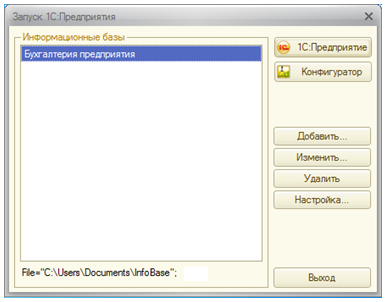Запуск программы «1С:Предприятие 8» осуществляется также, как и запуск любого другого Windows-приложения: либо двойным кликом на соответствующей иконке на рабочем столе или панели задач, либо через меню кнопки »Пуск» (Пуск -- Все программы -- 1С:Предприятие 8 -- 1С:Предприятие). В результате открывается окно программы, в котором предлагается выбрать информационную базу и режим работы с ней.