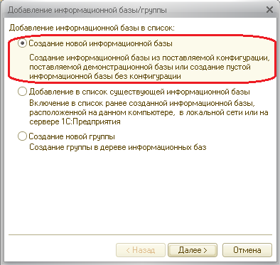 Знакомство с программой начнем с создания новой информационной базы.