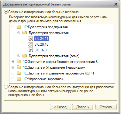 В следующем окне предлагается выбрать шаблон типовой конфигурации, на основании которого следует создать новую информационную базу. В данном случае мы разворачиваем ветвь «1С:Бухгалтерия предприятия», затем, в зависимости от потребности, разворачиваем список шаблонов либо чистых конфигураций, либо демонстрационных, содержащих уже определенные данные.