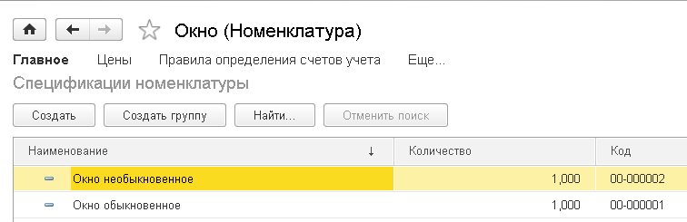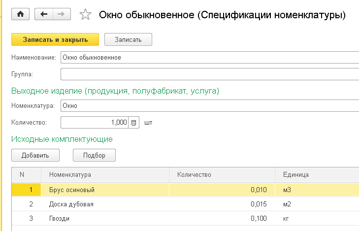 3. Зарегистрируйте следующие спецификации для номенклатурной позиции «Окно»: