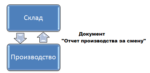 Если у организации склад готовой продукции и склад МПЗ один единственный, тогда можно и списание материалов и выпуск готовой продукции отражать в конфигурации одним документом «Отчет производства за смену».