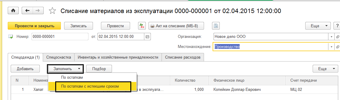 Следует обратить внимание на тот факт, что автоматическое списание спецодежды, спецоснастки и хоз. инвентаря по кнопке «Заполнить с истекшим сроком» отслеживает до календарных дней.