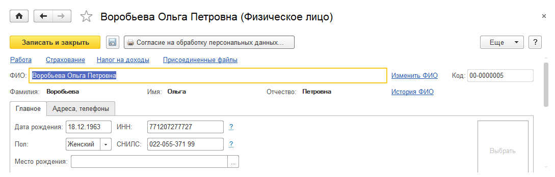 Личные данные человека при этом можно внести в карточку сотрудника, и они сохранятся в справочнике физических лиц. Нет необходимости отдельно открывать справочник физических лиц и вводить данные в него. Если требуется зарегистрировать с этим человеком оформление другого трудового договора, то можно создать нового сотрудника из раздела Работа карточки соответствующего физического лица.