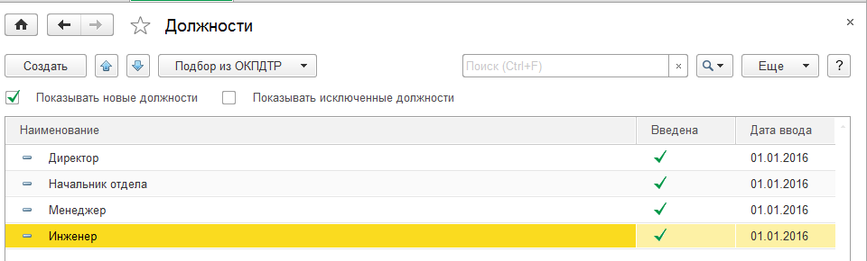 Откроем в разделе "Настройка" справочник "Должности" и заполним его следующими должностями (дата формирования 01.01.2016, краткое наименование будет заполнено автоматически при сохранении должности):