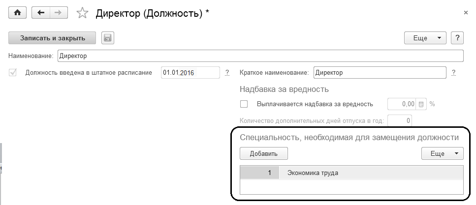 Специальности для замещения – если в настройках кадрового учета программы указано, что используются специальности для замещения должностей, то в должности можно перечислить специальности, которыми должен владеть сотрудник, занимающий ее. Специальности подбираются из справочника-классификатора "Специальности по ОКСО".