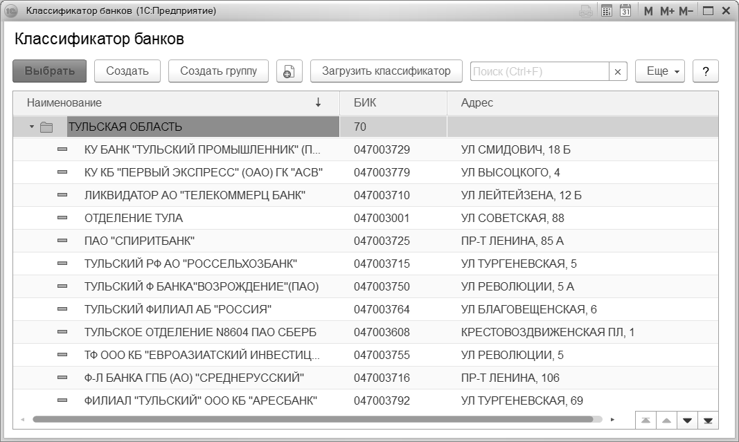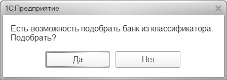 Если ответить Да, то открывается Классификатор банков (форма выбора), из которого можно подобрать нужный банк: