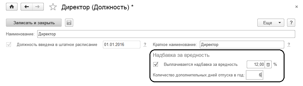 Вредность. Если в настройках расчета зарплаты программы указано использование надбавки за вредность, то в настройке должности могут указываться дополнительные сведения. Размер надбавки за вредность, а также количество дней дополнительного отпуска указываются, если работа в данной должности предполагает подобные льготы.