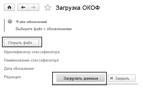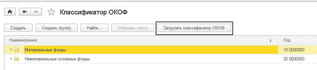 Классификатор ОКОФ стандартно поставляется пустым, который необходимо автоматически загрузить из файла okof.xml, поставляемого фирмой «1С» с основным установочным дистрибутивом. По кнопке «Загрузить классификатор ОКОФ» предварительно выбирается файл и загрузка производится автоматически: