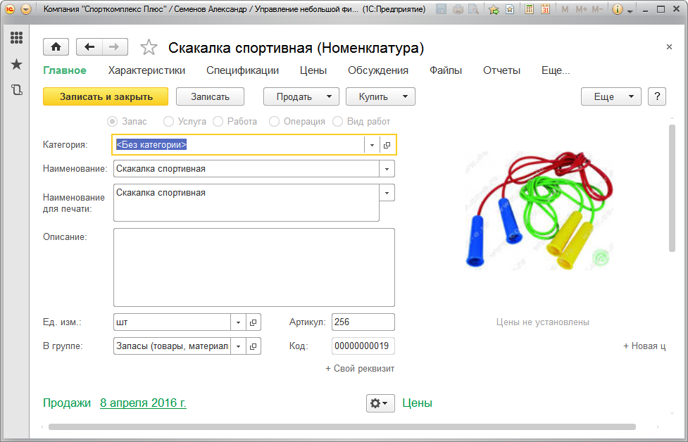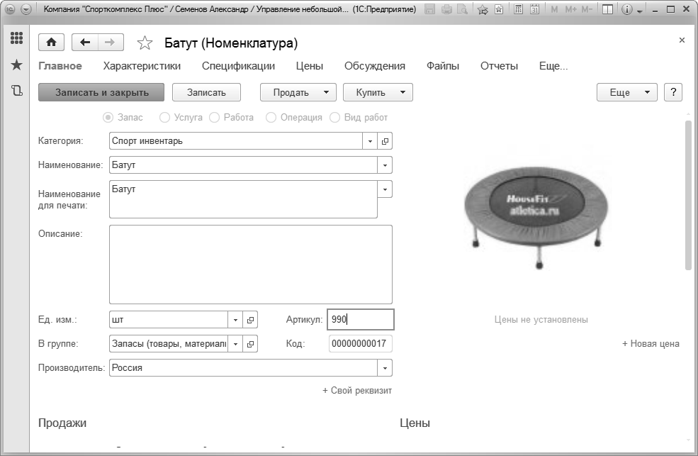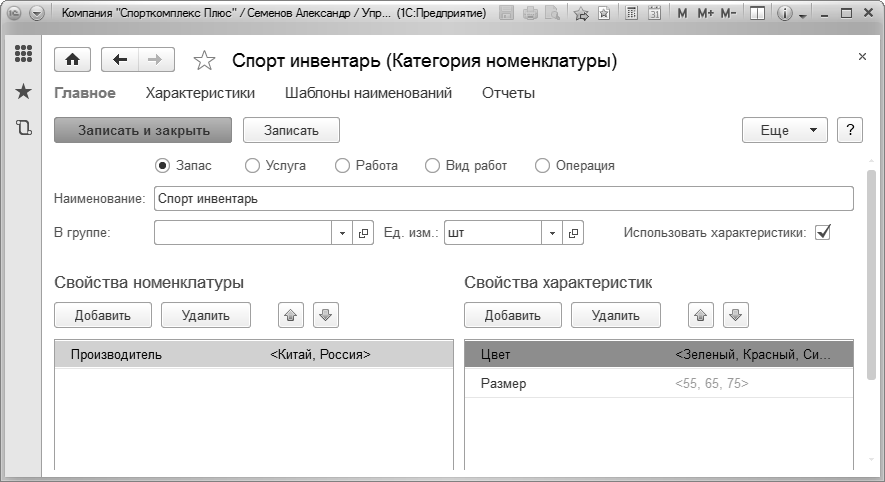 - "Категория" – это перечень номенклатурных позиций, схожих по своим свойствам и дополнительным характеристикам. В данном примере категория "Спорт инвентарь" определяет наличие свойства (доп.реквизита) "Производитель" и дополнительных характеристик "Цвет" и "Размер".
