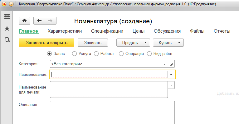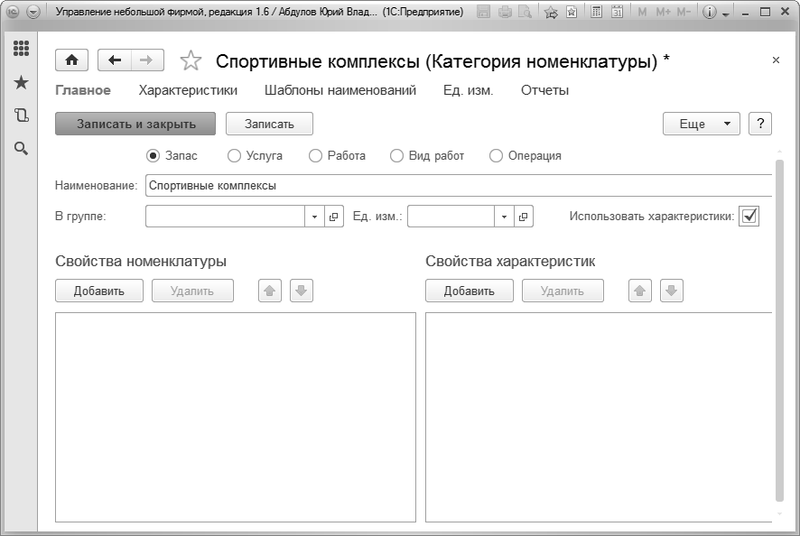 После того, как введены основные данные о номенклатурной позиции, необходимо не забыть о вводе характеристик, если они предполагаются по данному запасу.