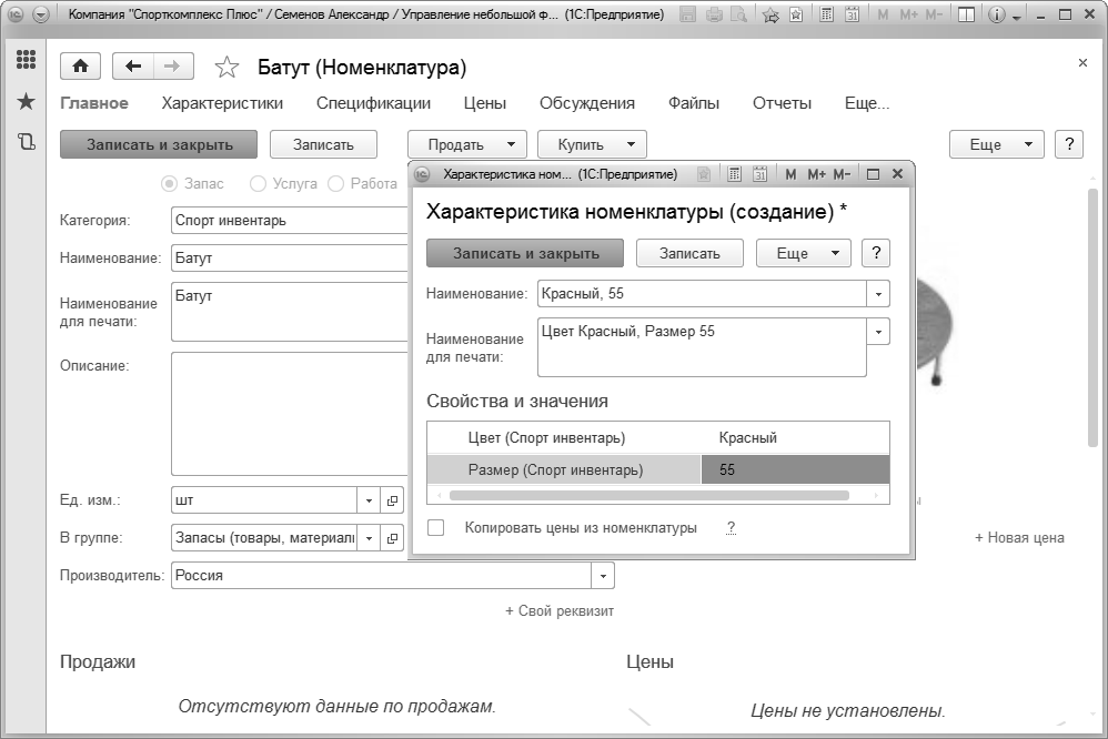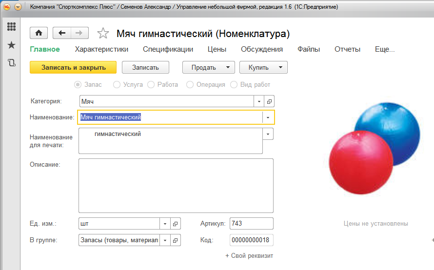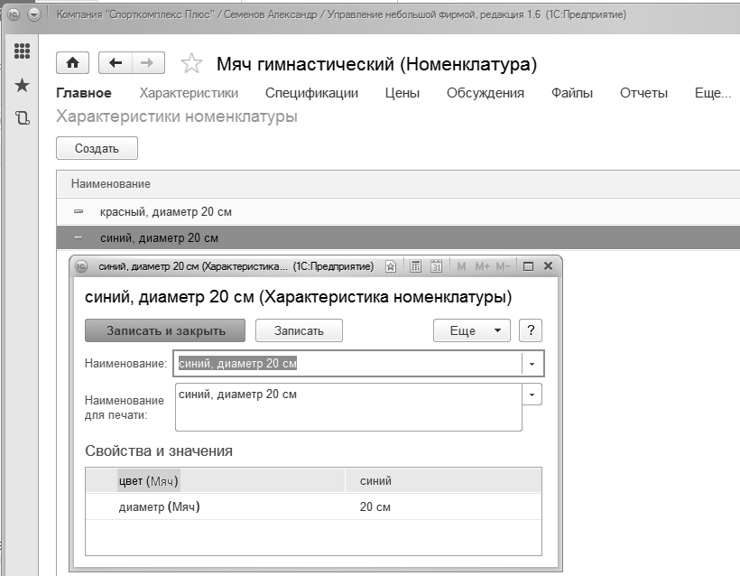 Как упоминалось выше, категория, в данном случае "Мяч", определяет наличие дополнительных характеристик "Цвет" и "Диаметр". Для перехода к характеристикам номенклатуры необходимо нажать на ссылку "Характеристики" в верхней части карточки…