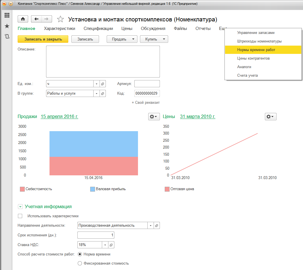 Кроме того, для номенклатуры типа "Работа" с помощью ссылки "Нормы времени работ" (см. Рис. 119) можно ввести данные о нормативном времени (в часах) на выполнение данной работы.