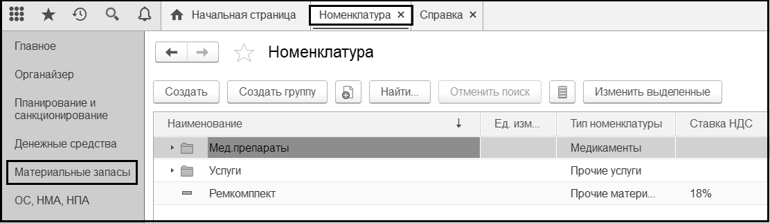 Справочник Номенклатура можно открыть с помощью команды Номенклатура меню функций раздела Материальные запасы.