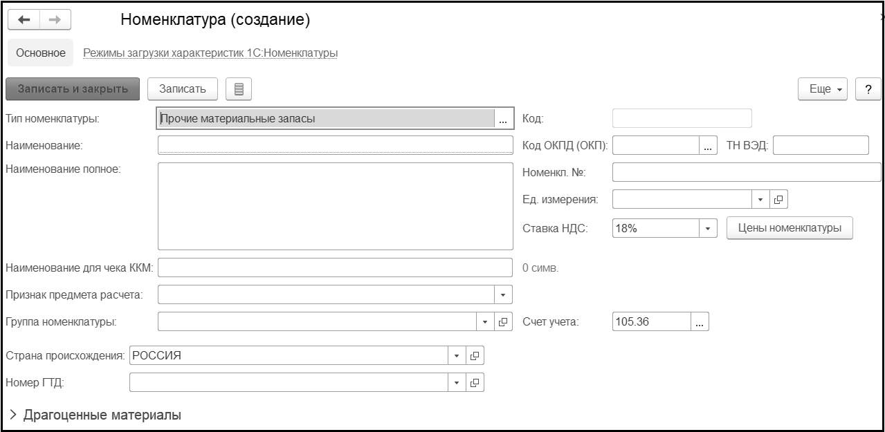 Для элементов справочника с типом номенклатуры Работа, Услуга и Гос. услуга недоступны для заполнения реквизиты Счет учета и Страна происхождения.