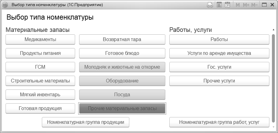 В справочнике Номенклатура ведется список номенклатуры материальных запасов – материалов, медикаментов и перевязочных средств, продуктов питания, тары, оборудования, требующего монтажа, запасных частей к машинам и оборудованию, мягкого инвентаря и посуды, молодняка и животных для откорма.
