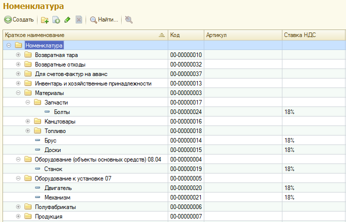 - В справочник «Номенклатура» добавьте внеоборотные активы: