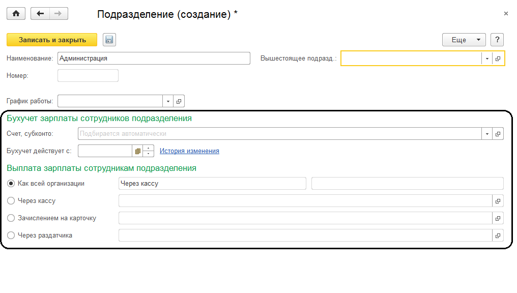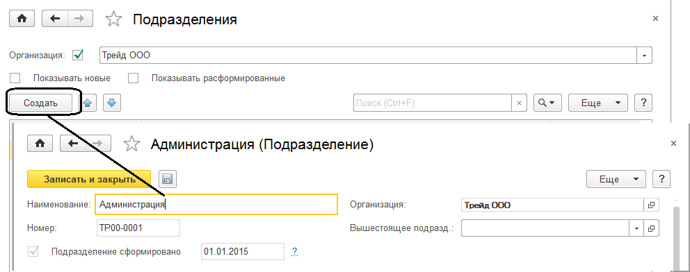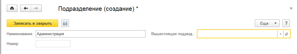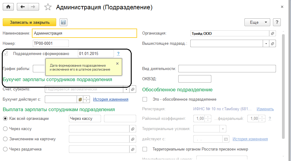 Добавим подразделение «Администрация»: укажем наименование и дату формирования – 01.01.2015. Остальные настройки пока заполнять не требуется. Подразделение следует записать и закрыть.