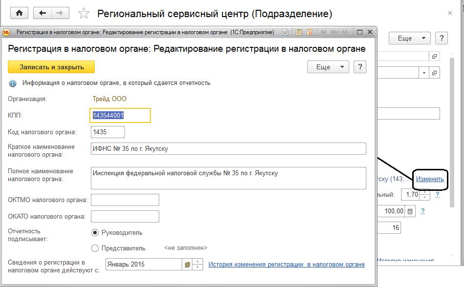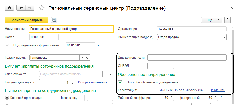 Подразделение «Региональный сервисный центр» будет обособленным подразделением. Уставим соответствующий флаг в его настройках, а также уточним регистрацию в налоговом органе для данного подразделения в его карточке по команде "Изменить ":