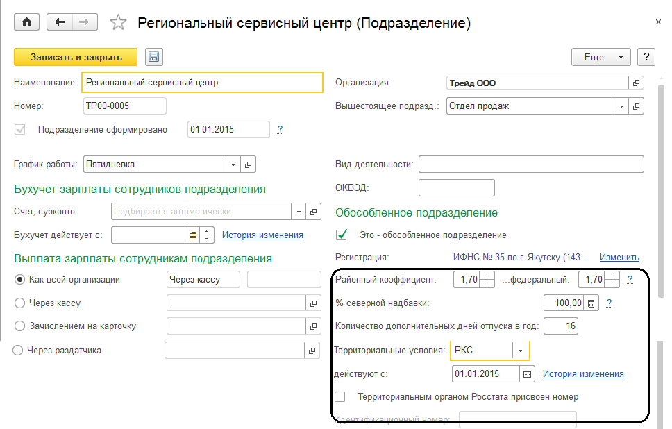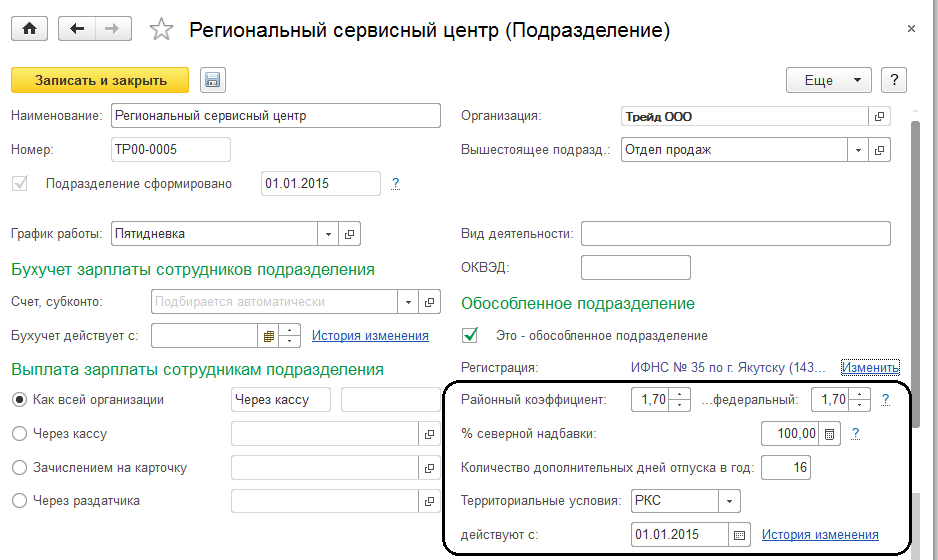 Районные особенности. Если подразделение находится в сложных климатических условиях (в отличие от всей организации), то в карточке подразделения можно указать порядок применения районных коэффициентов и других территориальных особенностей (аналогично тому, как эти реквизиты настраиваются для всей организации, если в настройках организации установлены соответствующие флажки).