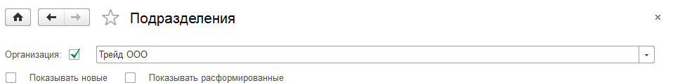 Откроем в разделе «Настройка» справочник "Подразделения". Заполним структуру подразделений для организации ООО «Трейд» - организацию следует сразу выбрать в верхней части.