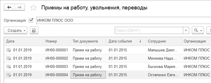 Рис. 3.3.2. Список документов "Прием на работу"