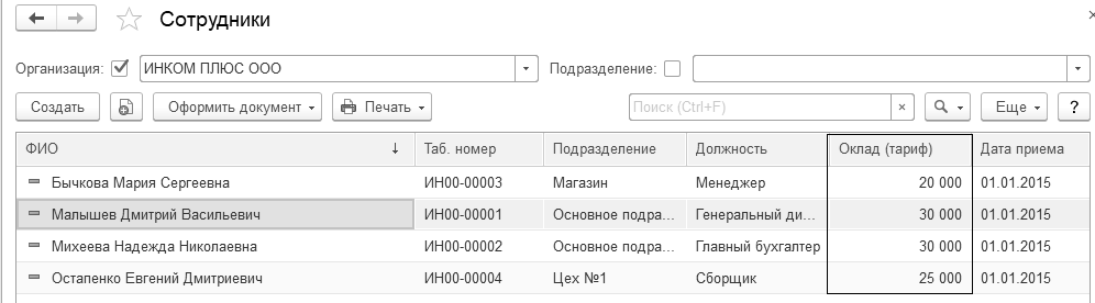 Настройте форму списка работников организации "ИНКОМ ПЛЮС". Выведите графу "Оклад".