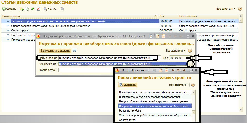 Важной особенностью данного справочника является то, что в справочник можно добавлять элементы без заполнения реквизита «Вид движения денежных средств». Данная возможность важна в тех ситуациях, когда какие-то операции по кассе и/или банку интересуют с точки зрения аналитической отчетности, но не должны попадать в форму №4, например, перемещение денежных средств из кассы организации в банк.