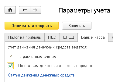 Как было указано выше, добавление в программу аналитического учета в разрезе статей движения денежных средств осуществляется на форме «Настройка параметров учета», путем установки соответствующего флажка на закладке «Денежные средства».