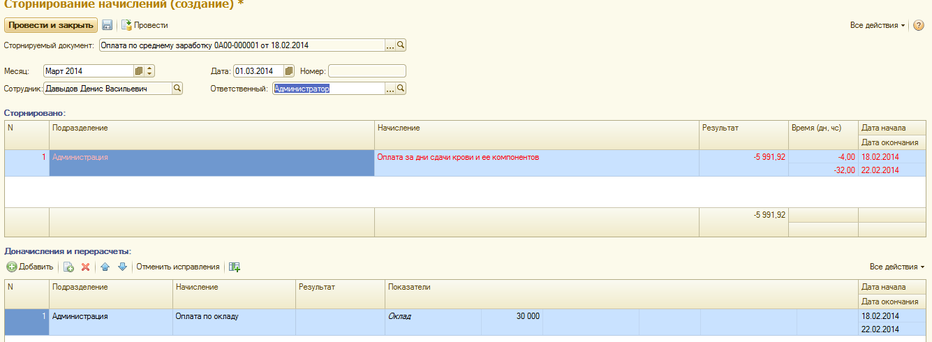 В данной конфигурации помимо сторнирования существует возможность произвести ручное исправление и перерасчет данных. Для этих целей в некоторых документах по расчету сумм начислений сотрудникам, предусмотрена команда "Исправить". В этом случае будет создан новый документ в текущем периоде, сторнированы начисления выбранных сотрудников. Команда "Исправить" появляется только в документах прошлых периодов, когда произведен окончательный расчет заработной платы и сформирован и проведен документ "Отражение зарплаты в учете".