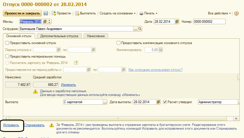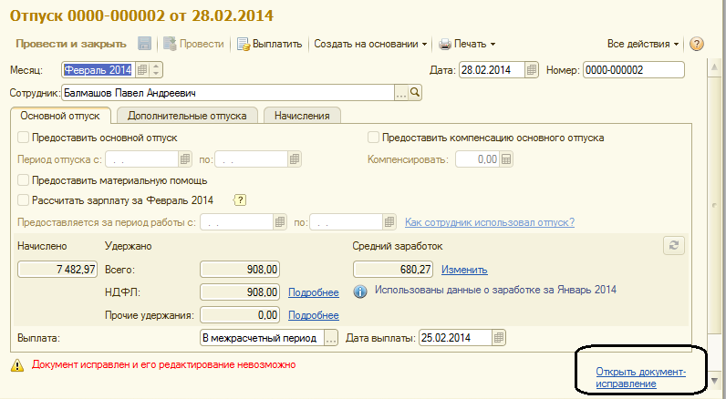 Сотруднику Балмашову П.А. в феврале начислена сумма отпускных (учебный отпуск). В марте оказалось, что отпуск заканчивается раньше - 07.03.2014, необходимо отозвать из отпуска и пересчитать отпускные. Создадим документ-исправление. Для этого откроем февральский документ (в нем уже ничего не меняем!), и нажимаем команду "Исправить".