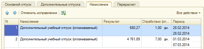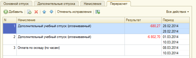 При этом будет создан новый документ-исправление с месяцем начисления Март. Новые сроки отпуска по 07.03.14 - укажем во вновь созданном документе, перерасчет будет произведен автоматически.