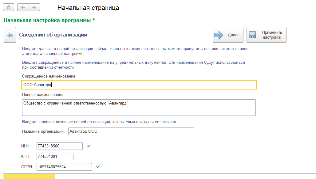 Заполним сведения об организации, по которой планируется вести учет в базе: