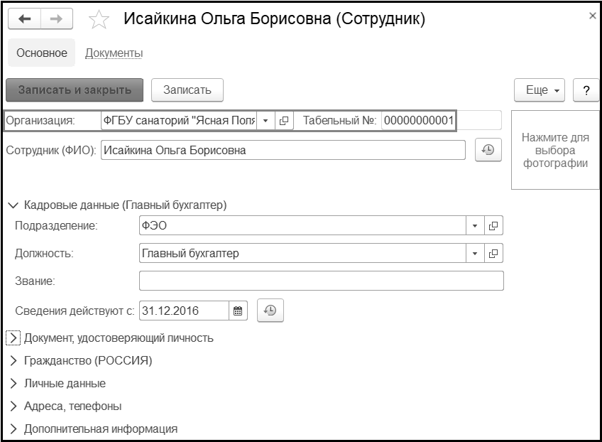 Данные сотрудника заполняются в разделах Документ, удостоверяющий личность, Гражданство, Личные данные, Адреса, телефоны и Дополнительная информация.