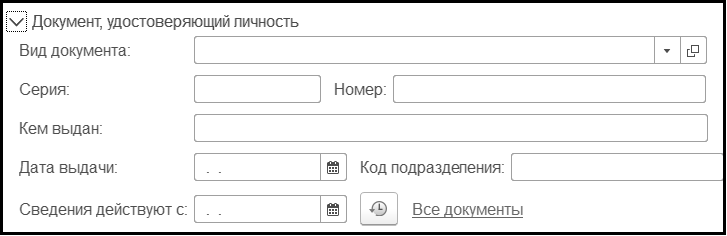 В разделе Документ, удостоверяющий личность указываются данные документа, удостоверяющего личность.