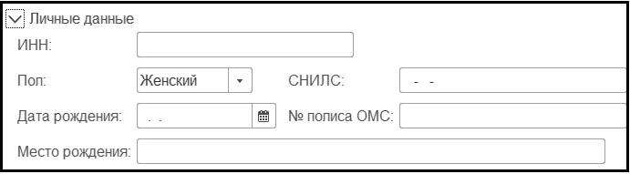 В разделе Личные данные вводятся пол сотрудника, его дата рождения, ИНН, СНИЛС, № полиса ОМС, место рождения.